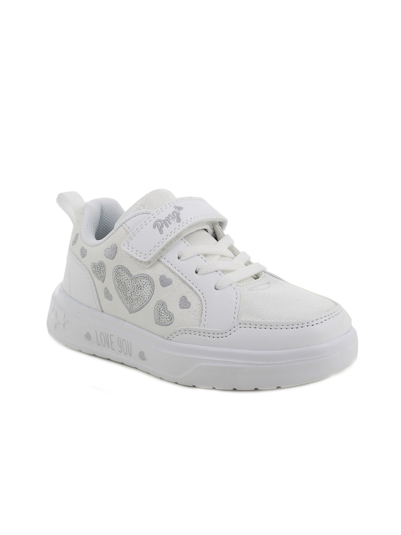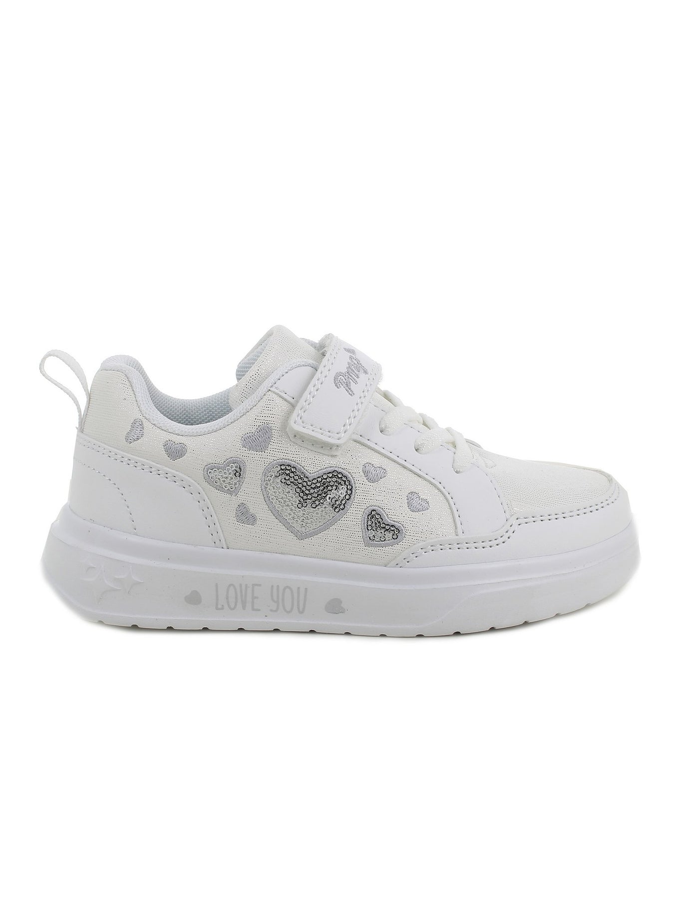 Tomaia Esterna: realizzata in materiale sintetico nella tonalità bianca con applicazioni a forma di cuore e dettagli decorativi luminosi, progettata per offrire resistenza, leggerezza e uno stile femminile