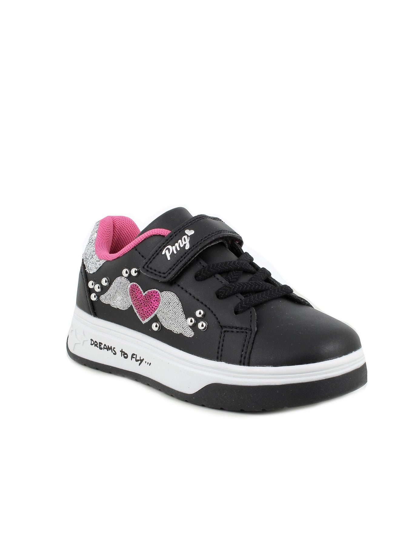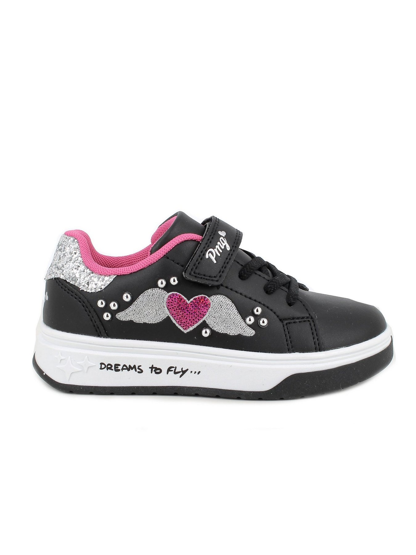 La sneaker PRIMIGI AVANT 89730 è un modello allegro e alla moda, pensato per accompagnare le bambine nelle attività quotidiane. Realizzata in materiale resistente nero, è decorata con un cuore glitterato rosa, ali argentate e dettagli luminosi che donano un tocco divertente e femminile.