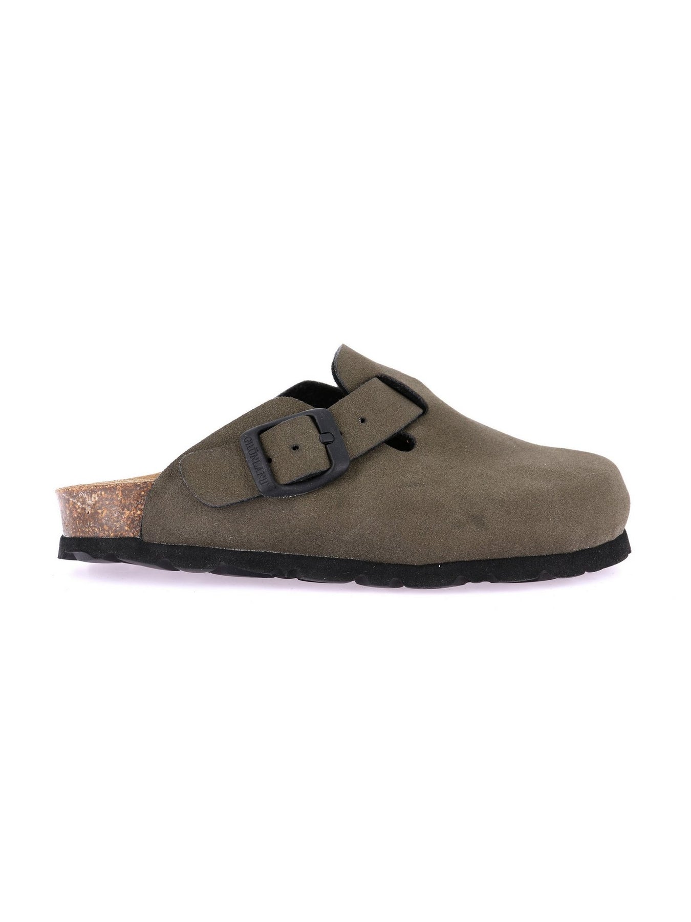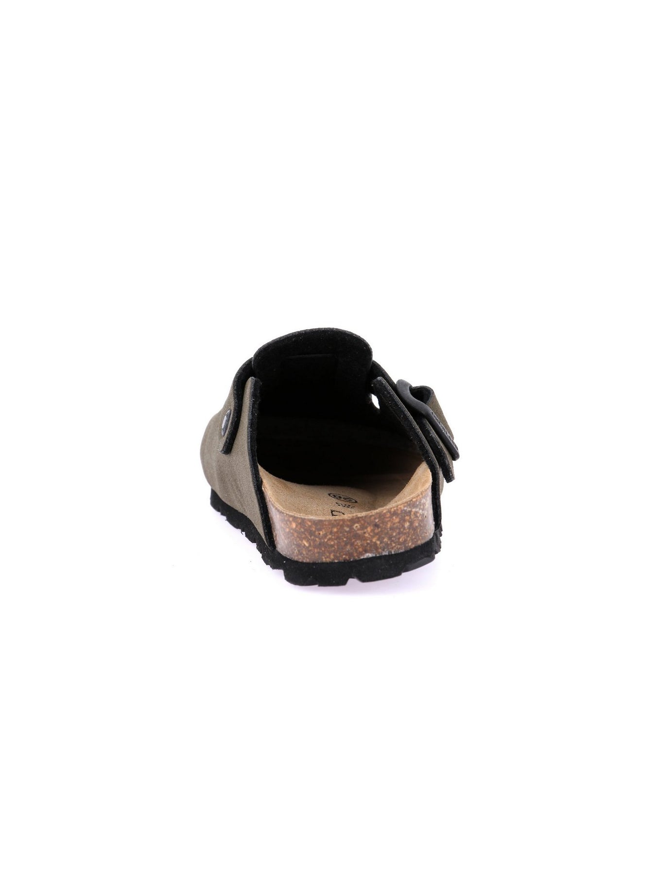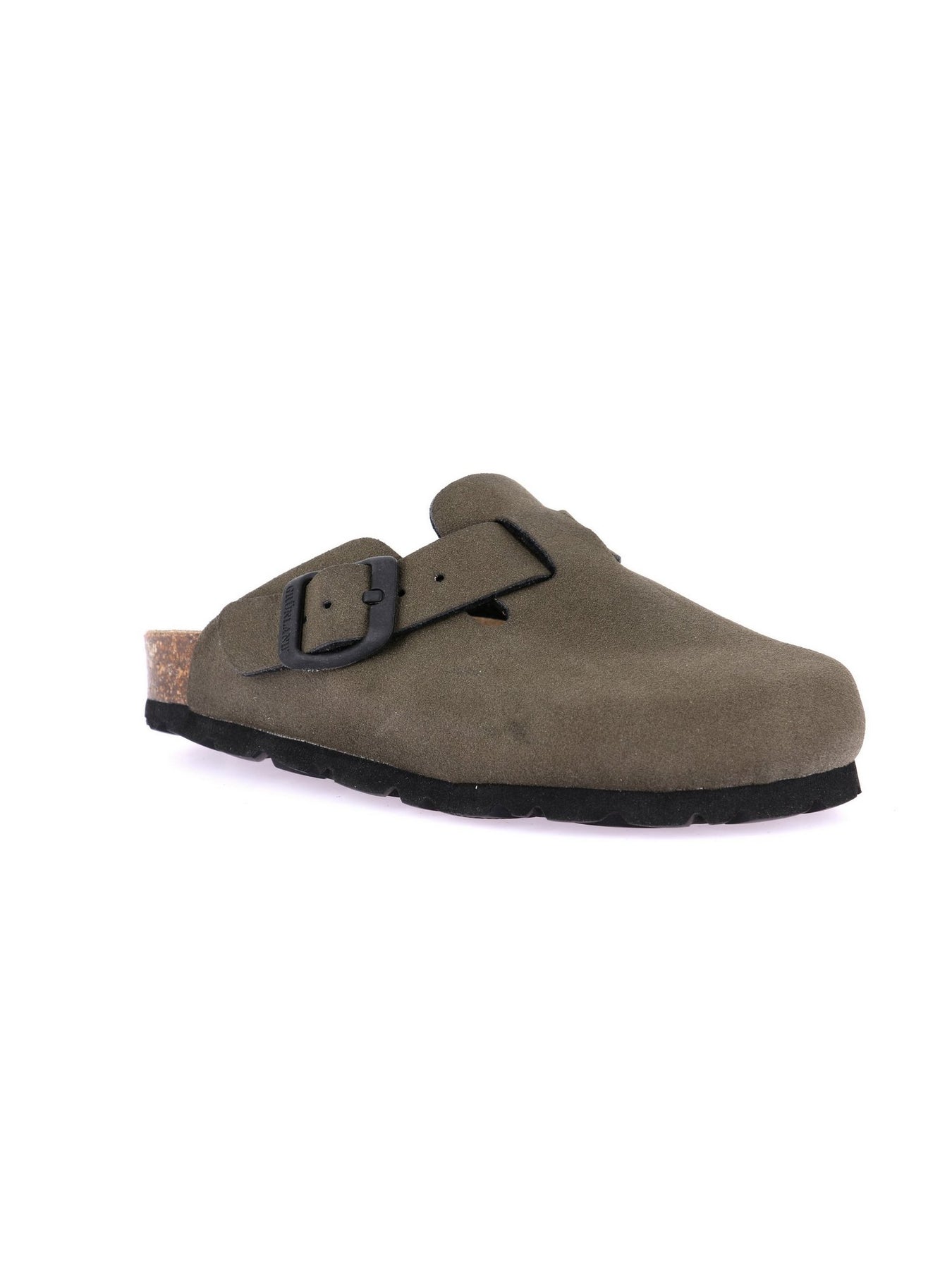 La tomaia in morbido materiale effetto scamosciato color oliva è dotata di una fibbia regolabile per una calzata sicura. Il sottopiede anatomico in sughero e pelle assicura supporto ottimale, mentre la suola in gomma flessibile garantisce stabilità e aderenza su ogni superficie. Perfetto per casa, scuola o tempo libero.