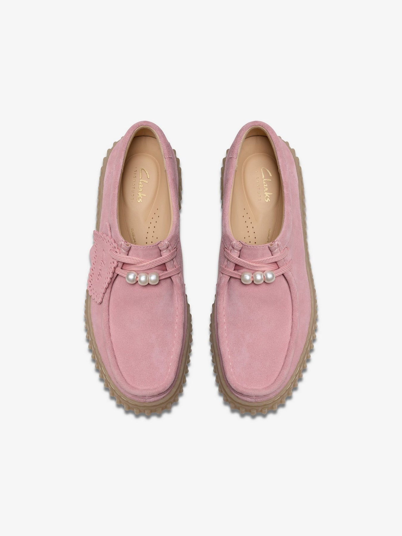 Realizzata in pelle scamosciata premium color rosa cipria (Dusty Rose), la Torhill Bee presenta una struttura compatta e raffinata con cuciture artigianali a vista e il classico tag Clarks laterale.