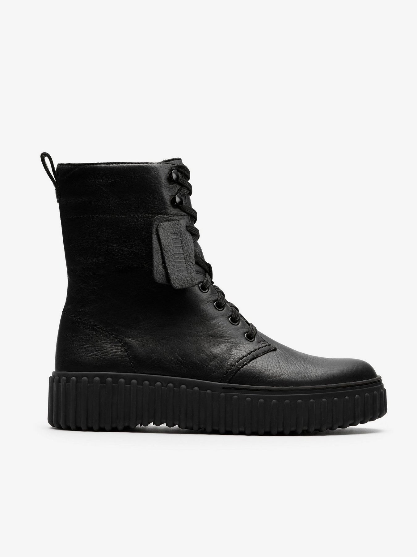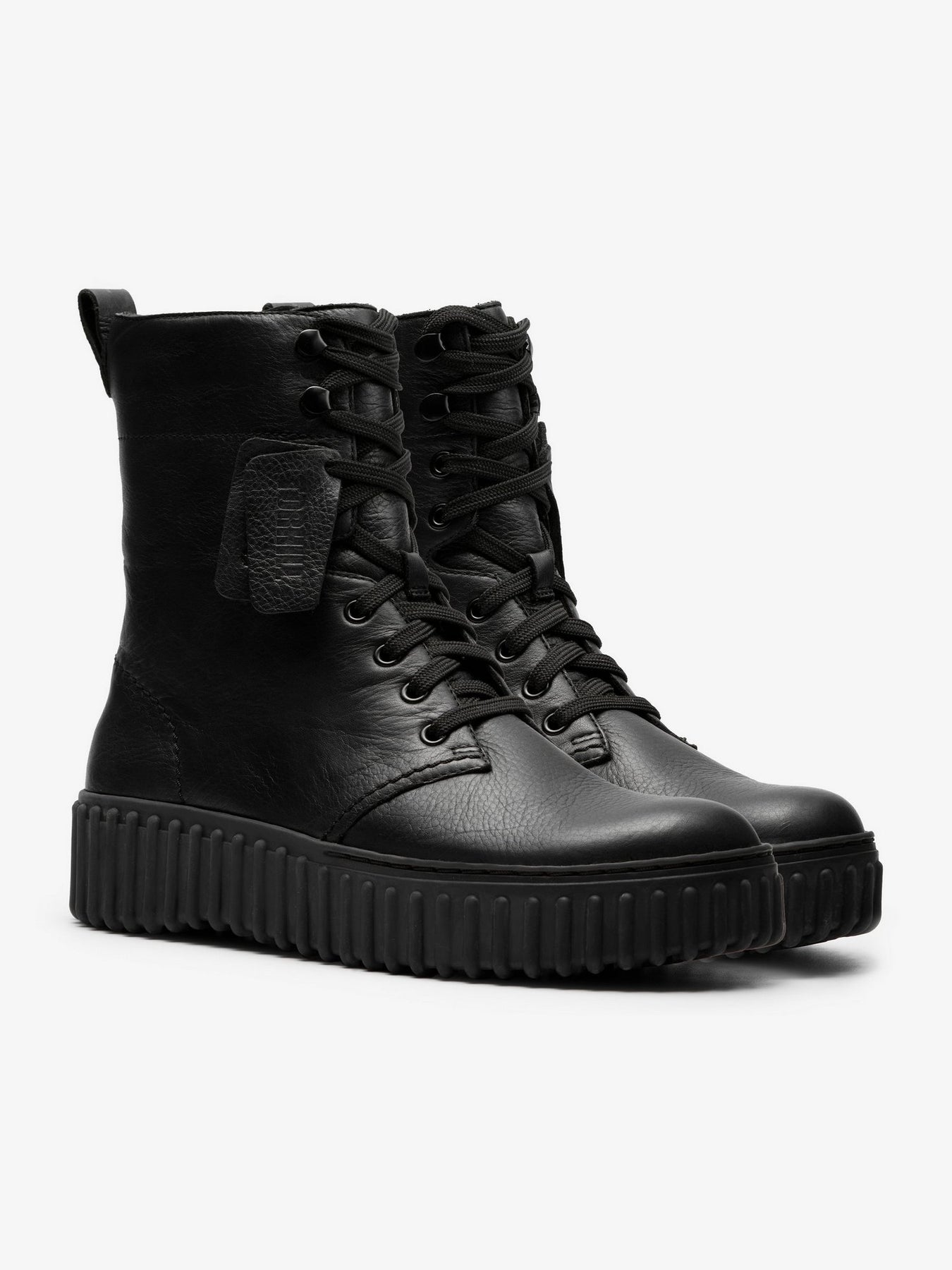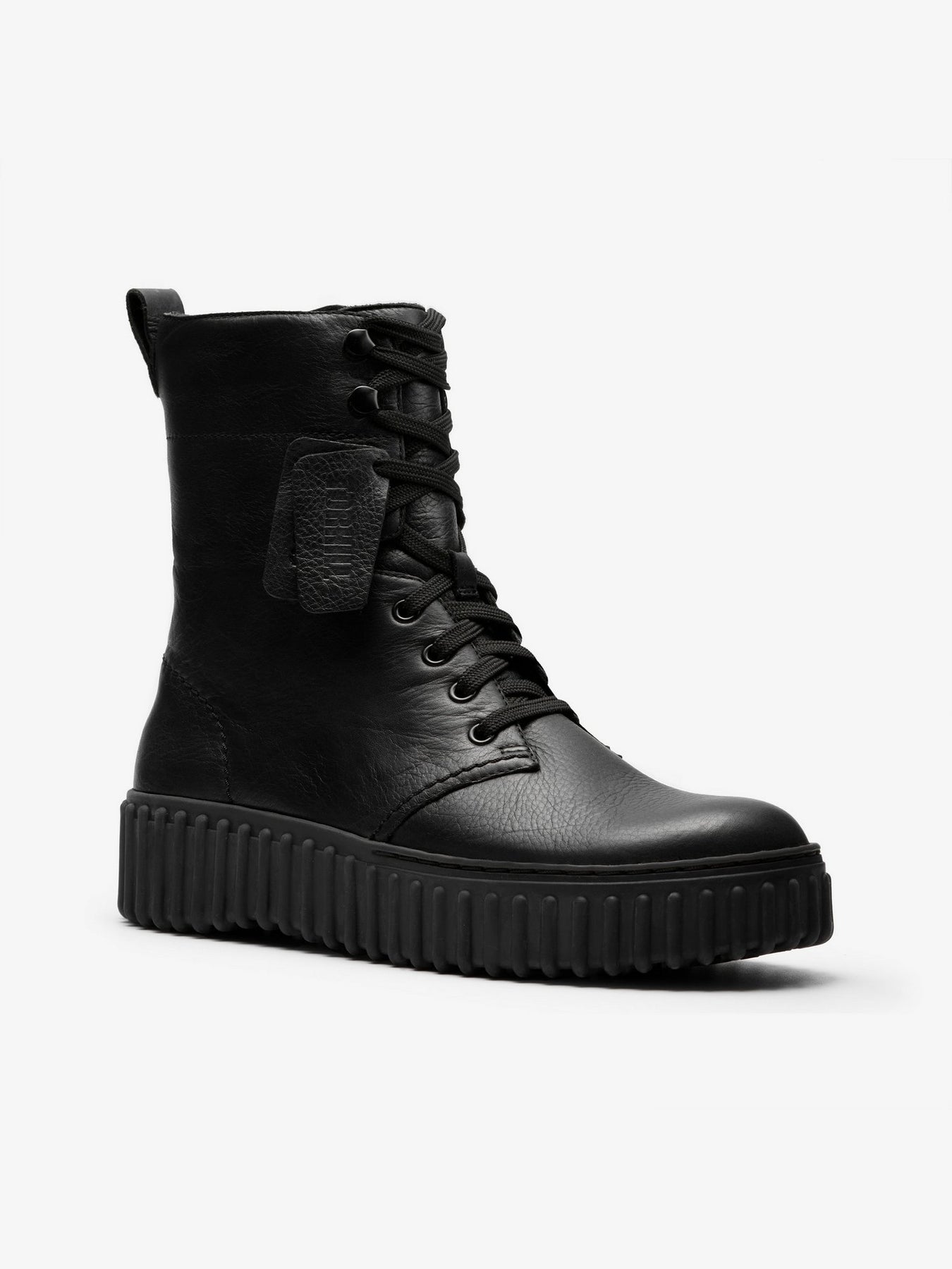 Realizzati in pelle nera di alta qualità, gli anfibi Torhill Style presentano una struttura alta con chiusura a lacci e una linguetta posteriore per agevolare la calzata. Le cuciture a vista e il tag Clarks laterale richiamano l'inconfondibile stile del brand.