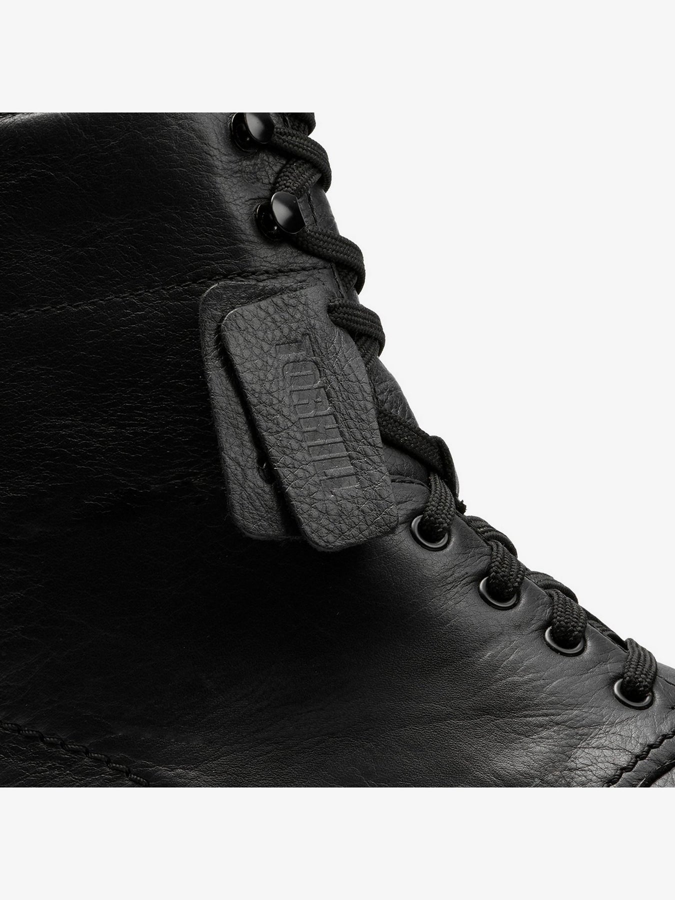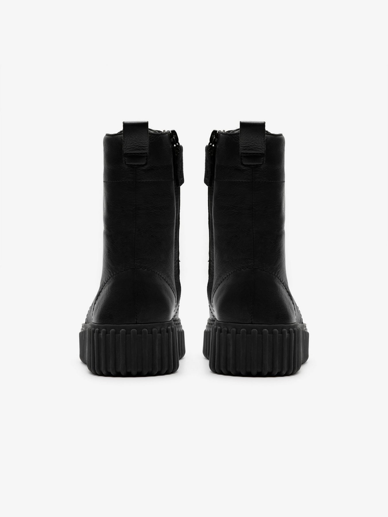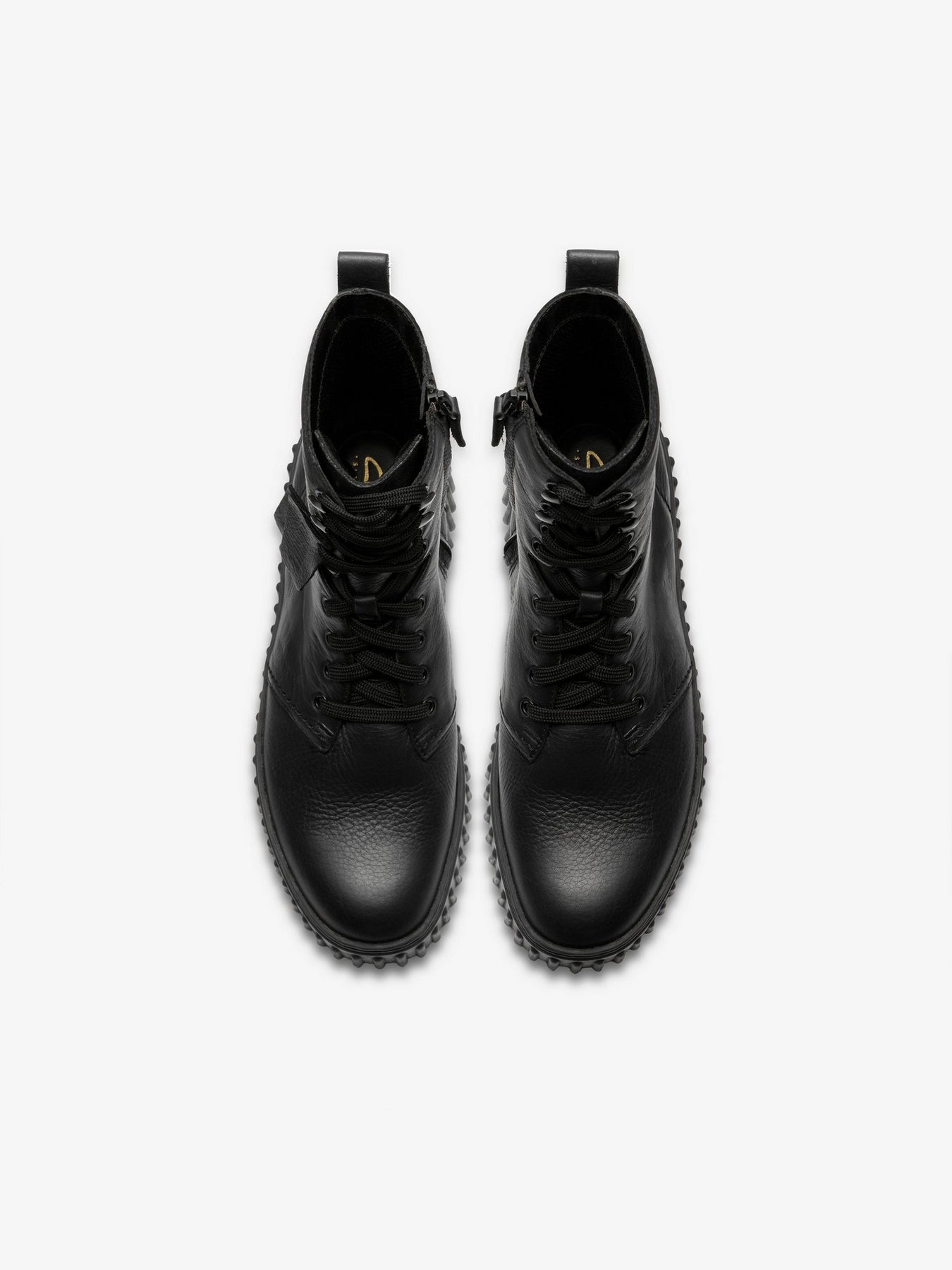 Realizzati in pelle nera di alta qualità, gli anfibi Torhill Style presentano una struttura alta con chiusura a lacci e una linguetta posteriore per agevolare la calzata. Le cuciture a vista e il tag Clarks laterale richiamano l'inconfondibile stile del brand.