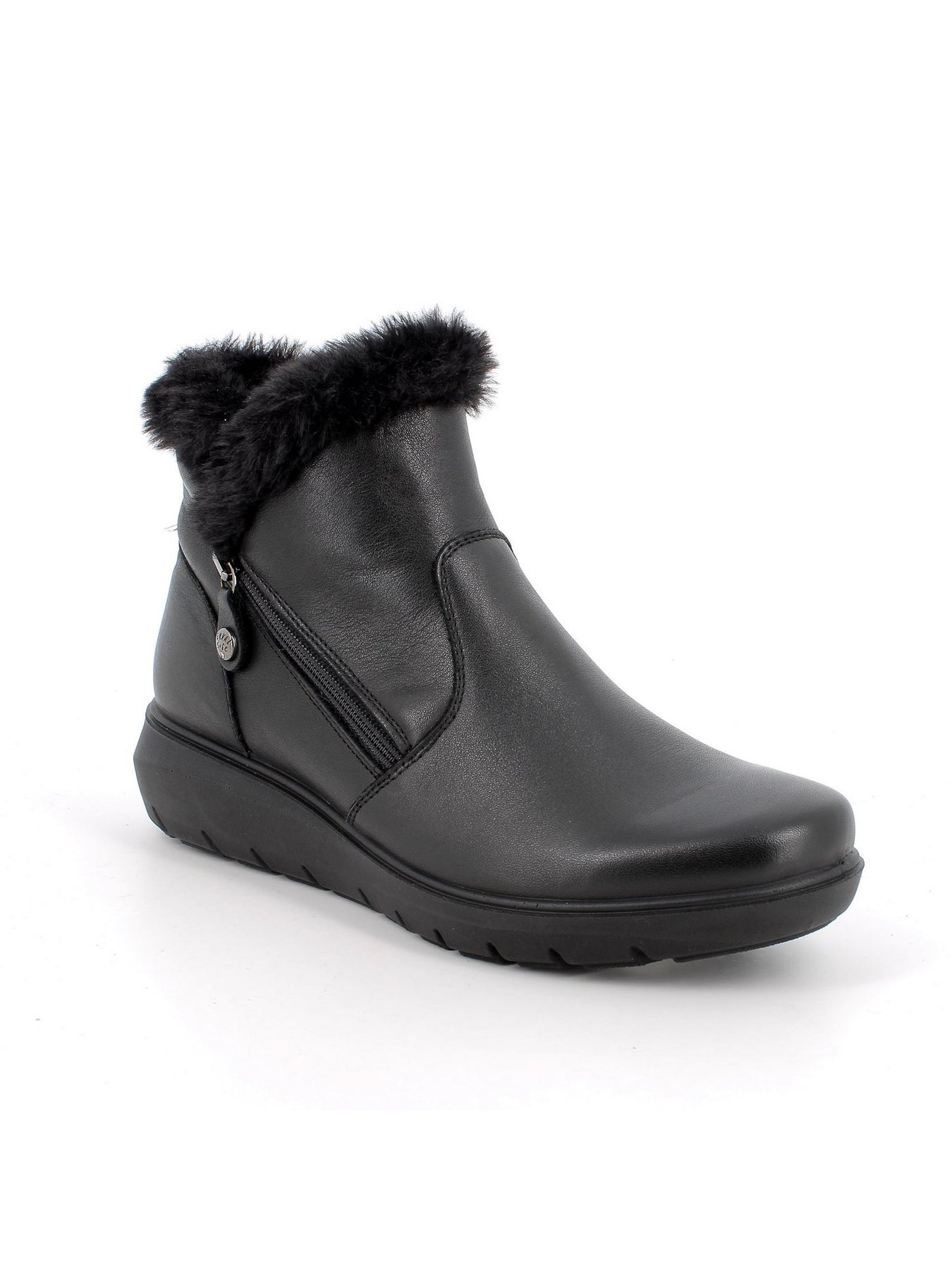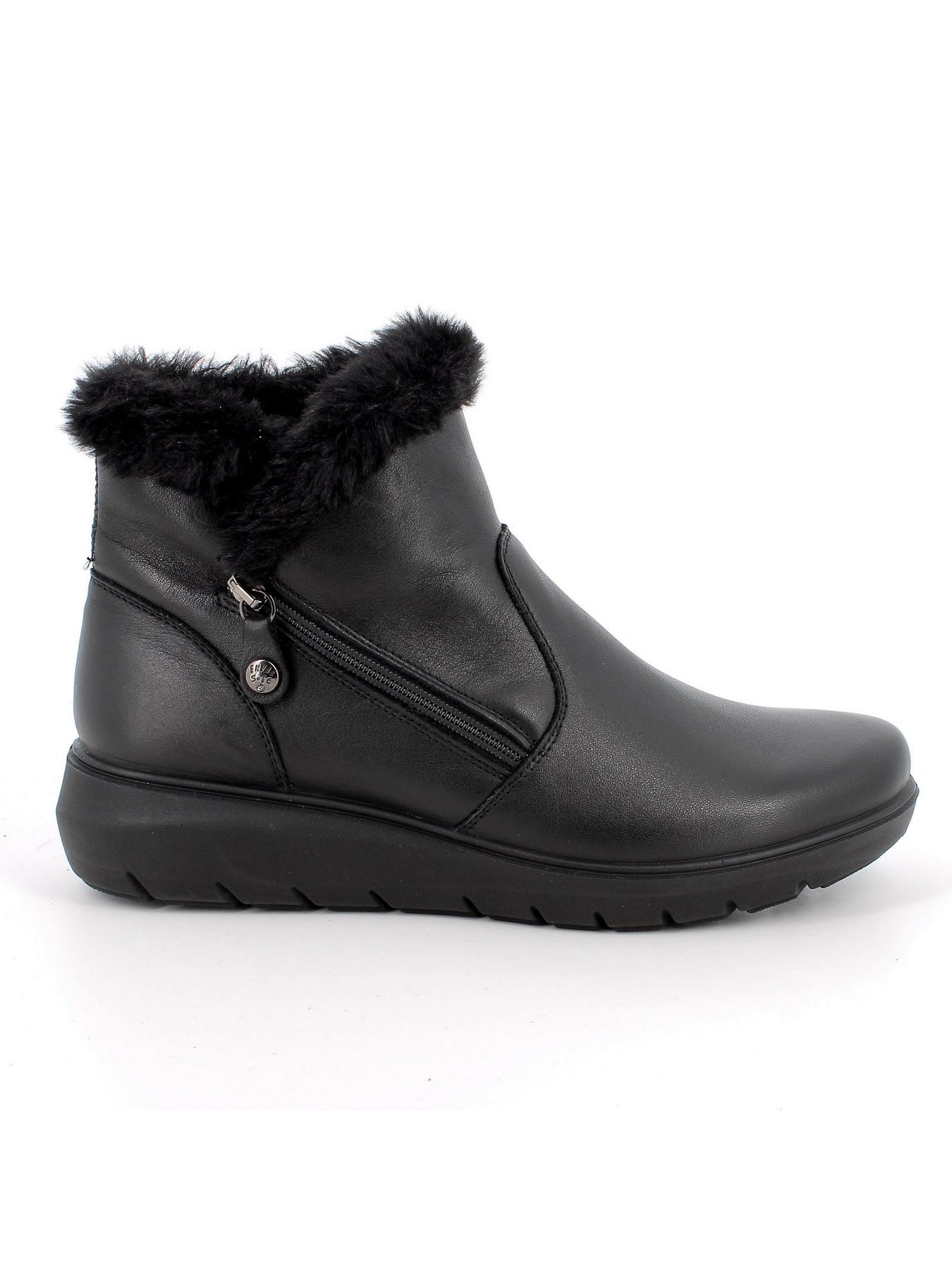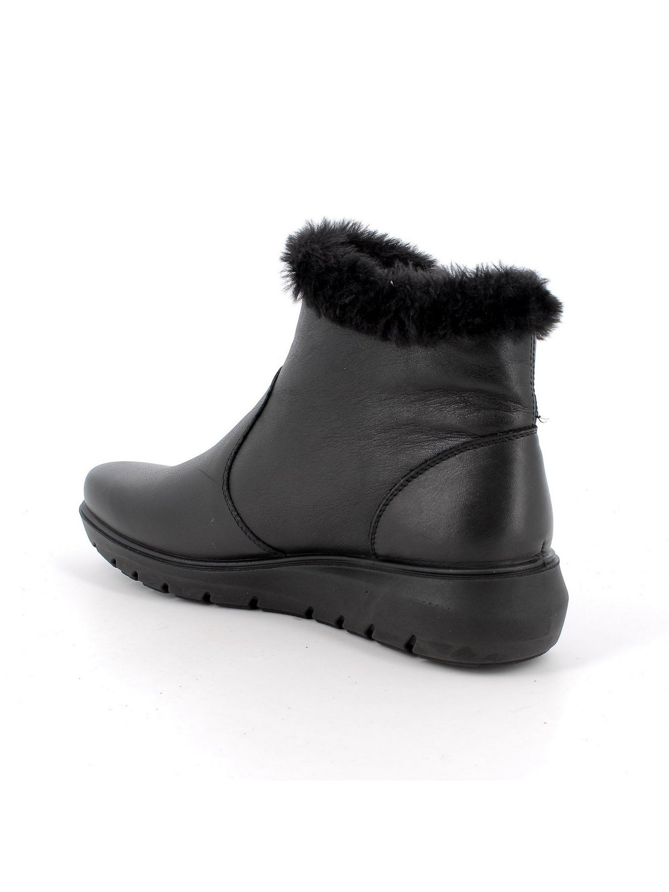 Il modello ENVAL SOFT 87737 è pensato per affrontare le giornate fredde con comodità ed eleganza. Realizzato in morbida pelle nera, presenta una pratica chiusura laterale con zip e un soffice bordo in eco-pelliccia che dona un tocco femminile e raffinato.