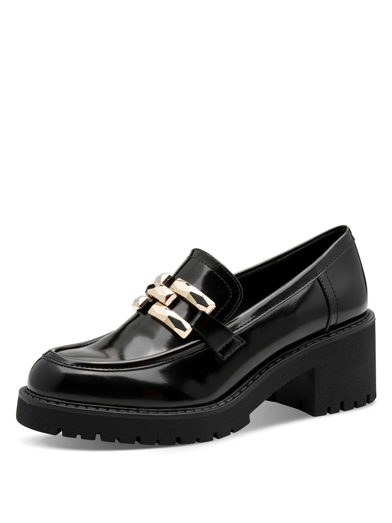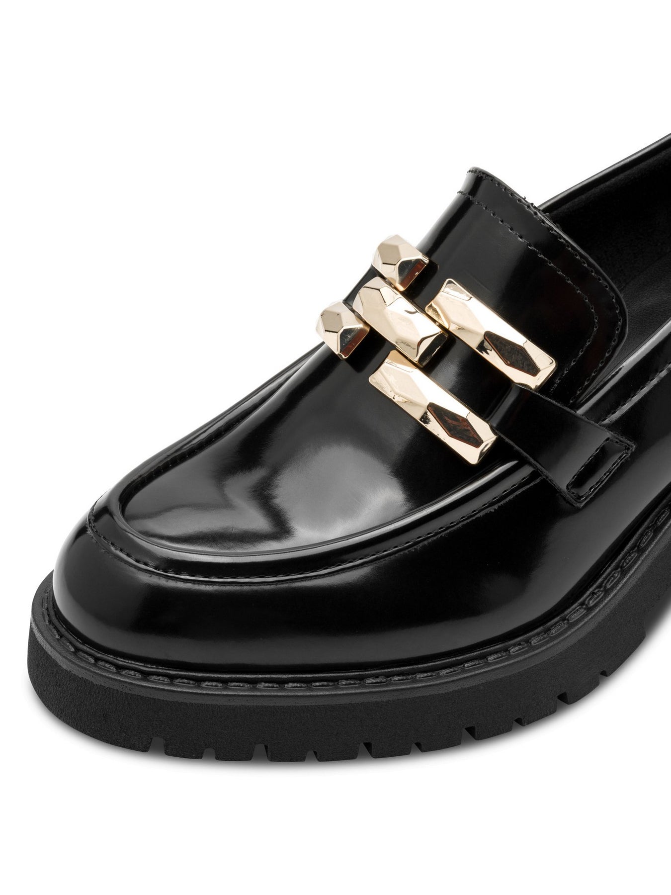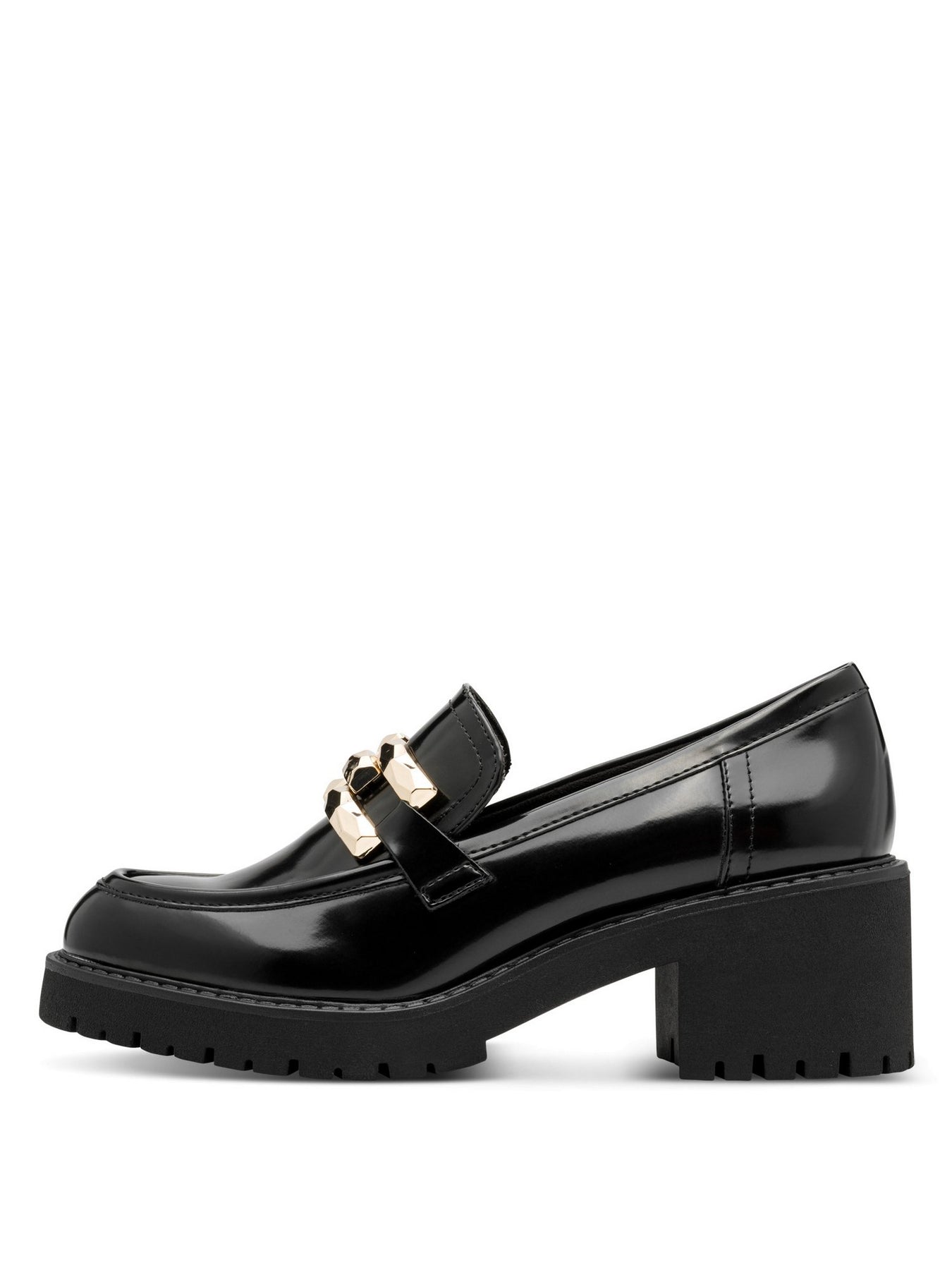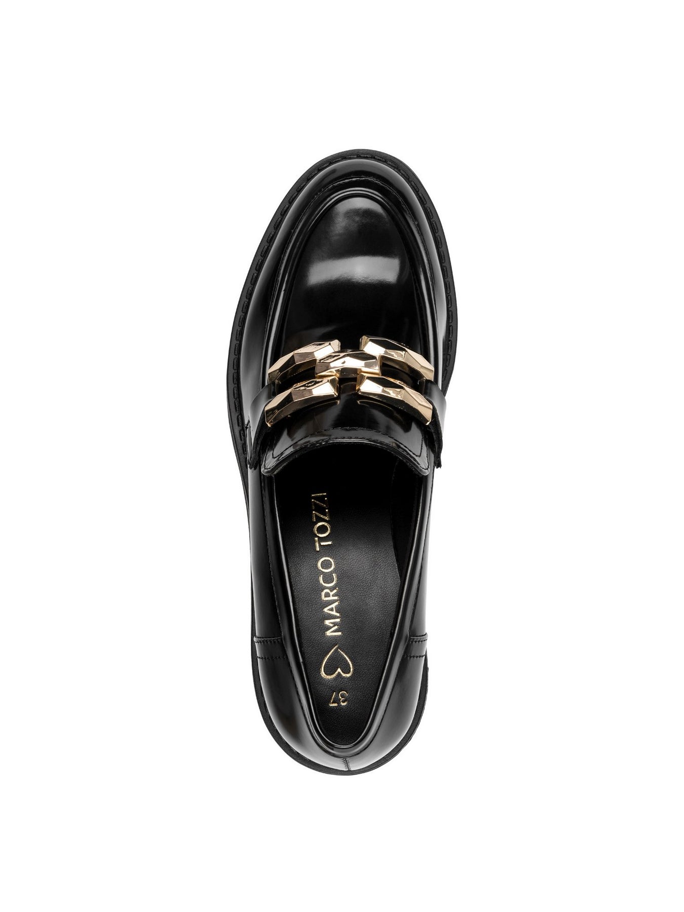 Il mocassino MARCO TOZZI 2-24770-43 in vernice nera è una calzatura dal carattere deciso e sofisticato. Realizzato in materiale sintetico lucido di alta qualità, è arricchito da un morsetto metallico dorato che illumina il design.
