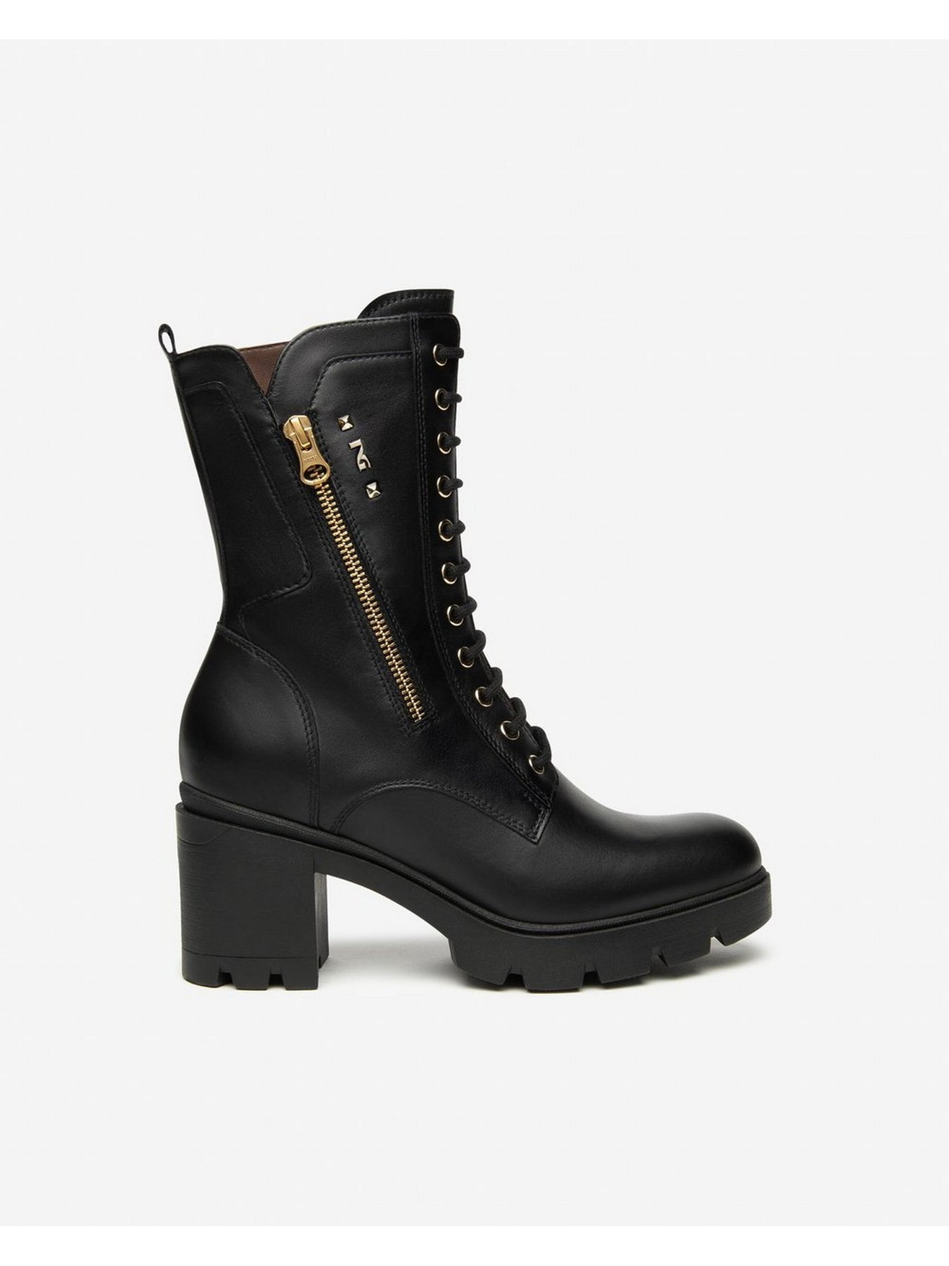 Realizzato in pelle nera di alta qualità, presenta lacci frontali e una zip laterale dorata che consente una calzata comoda e veloce, arricchendo il design con un dettaglio glamour.