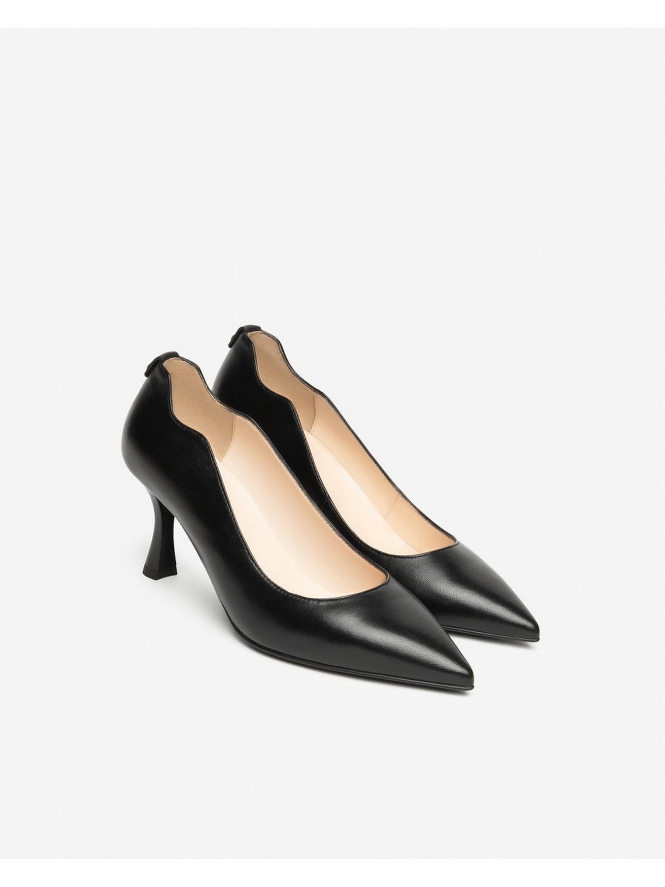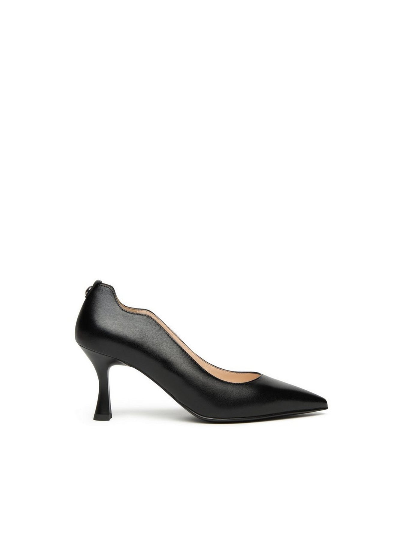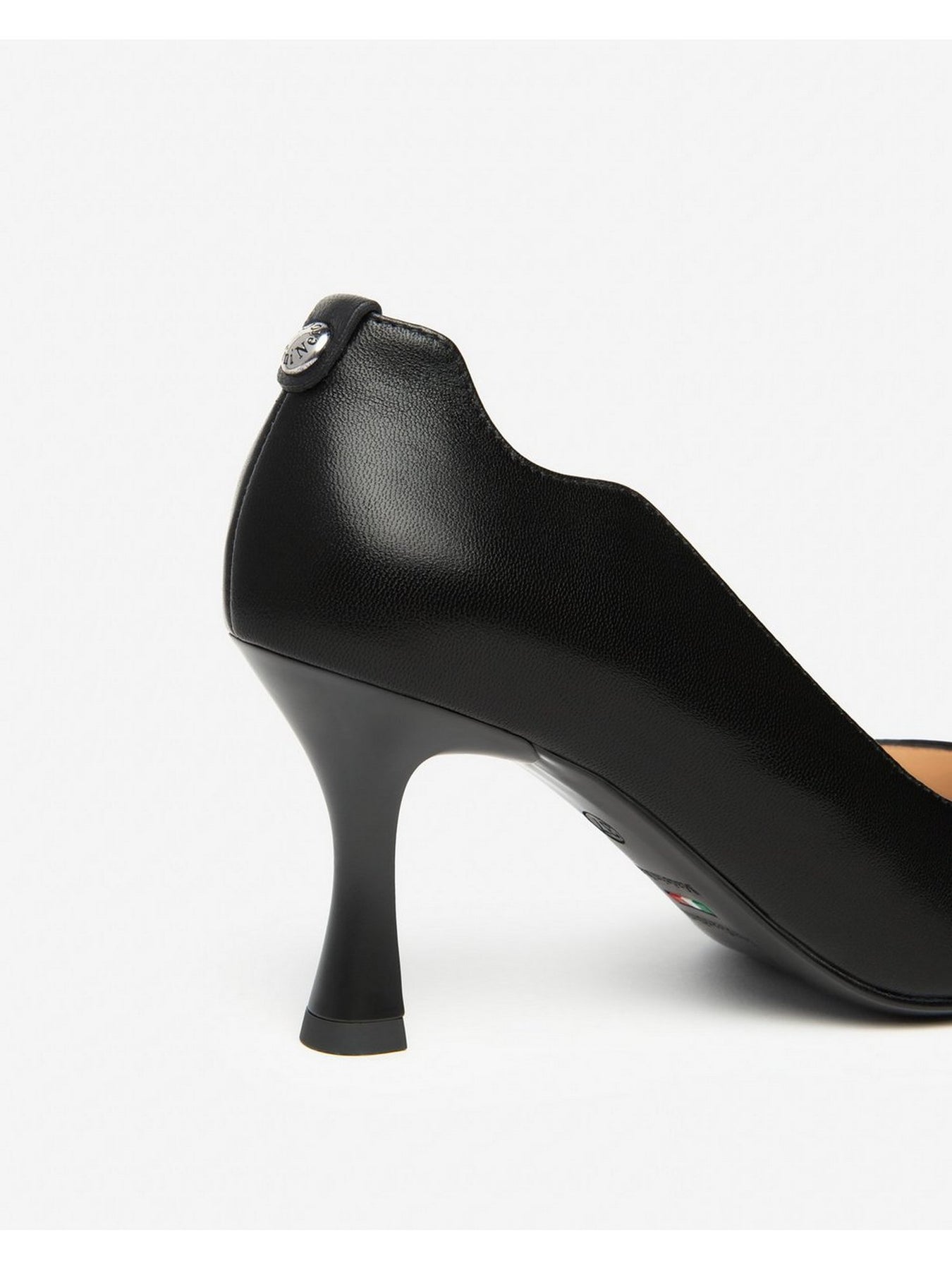 Realizzata in pelle nera liscia di alta qualità, presenta una punta affusolata che slancia la silhouette e un tacco medio scultoreo di circa 7 cm, stabile e confortevole.
