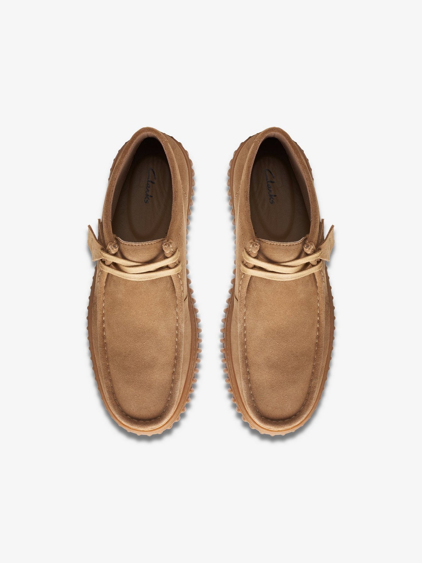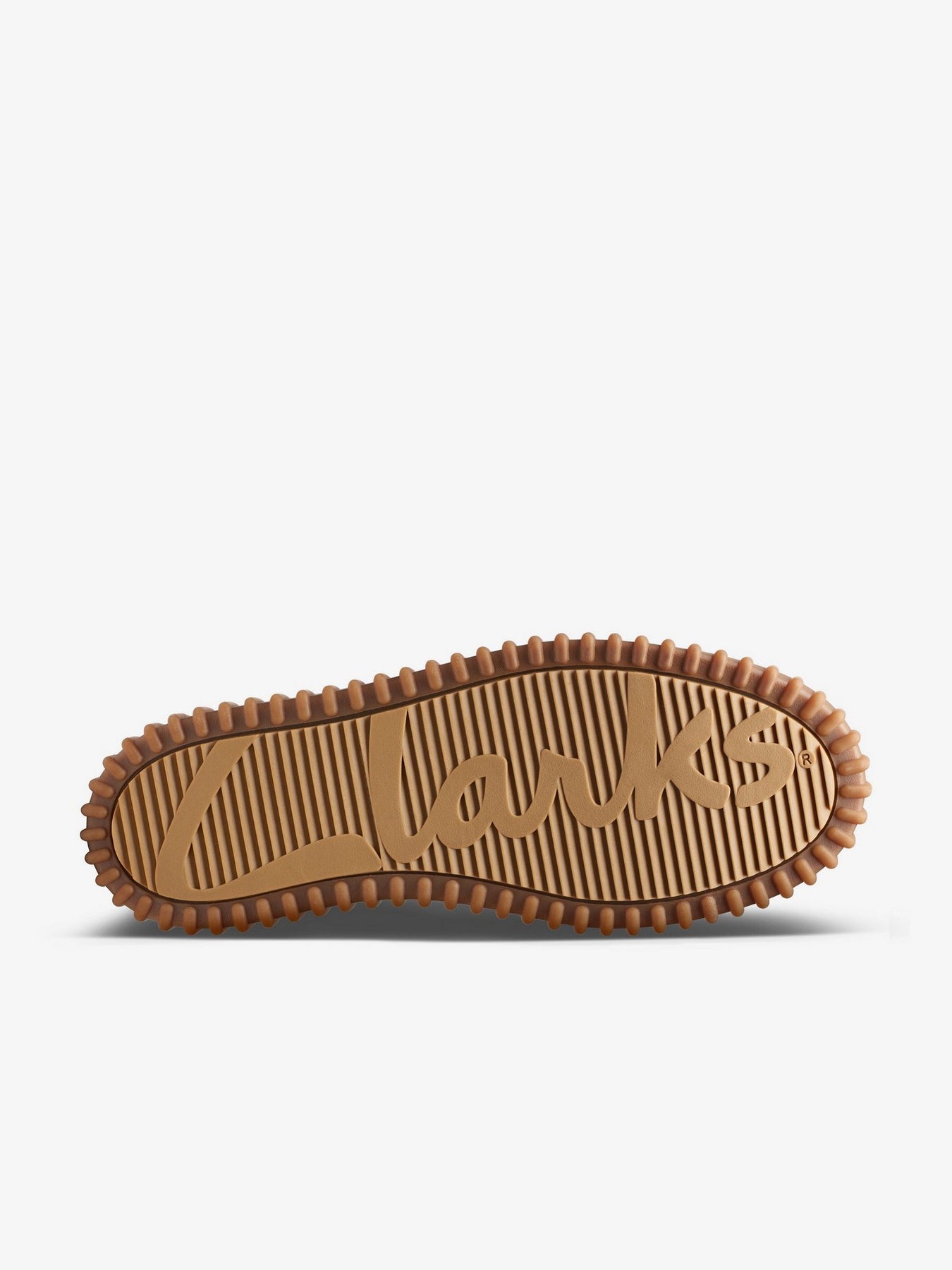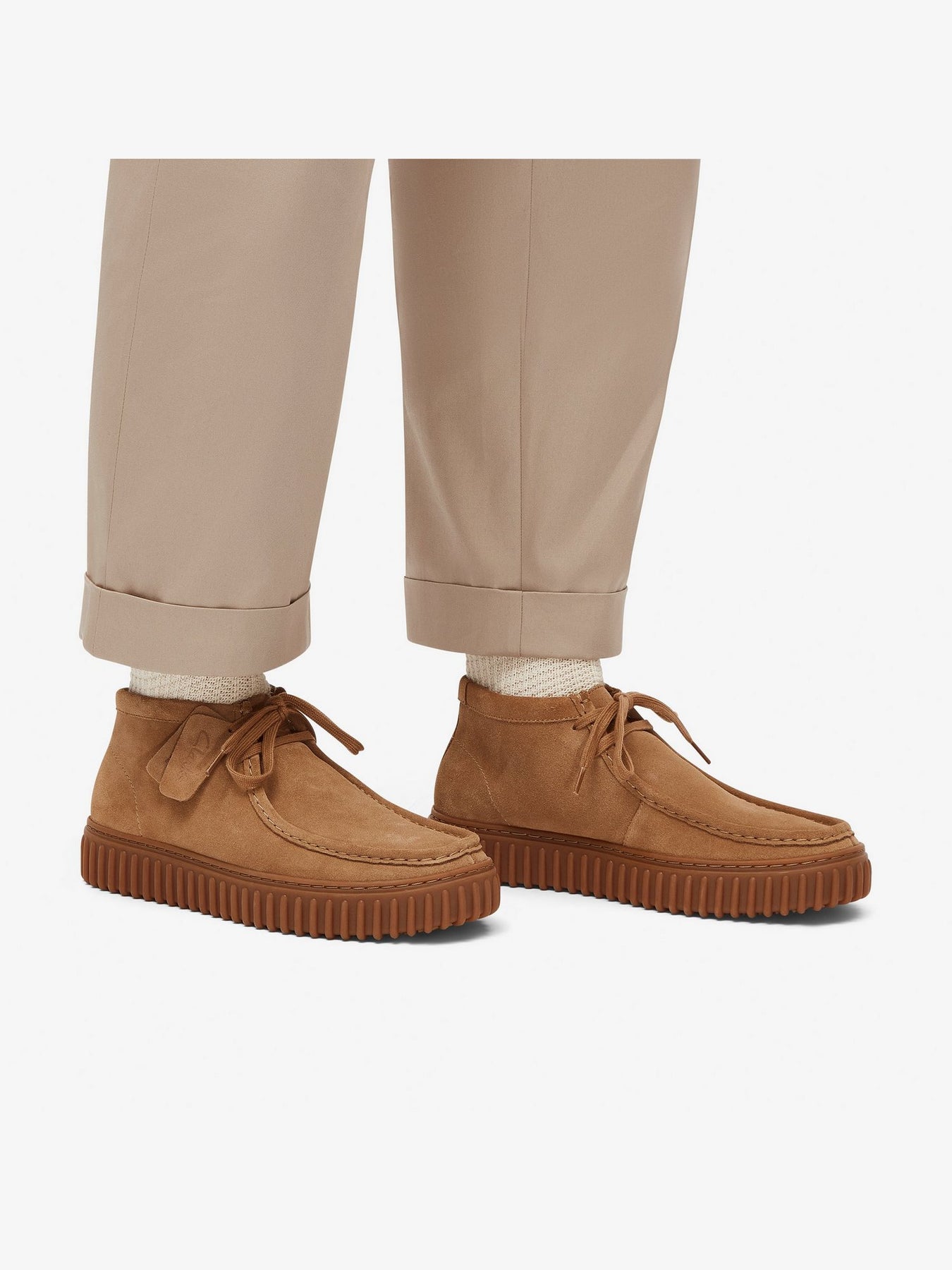 Realizzata in pelle scamosciata premium color sabbia scuro (Dark Sand), la Torhill Hi presenta cuciture artigianali a vista e il classico tag Clarks in pelle, simbolo di autenticità e qualità.