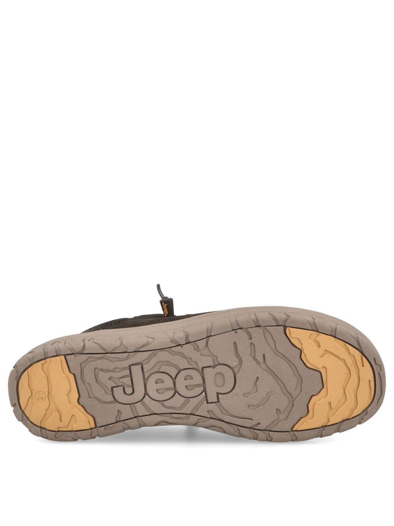 Realizzata in pelle nabuk marrone scuro, questa sneaker mid presenta cuciture a vista e un collarino imbottito in tessuto melangiato, pensato per offrire comfort extra e protezione alla caviglia. Il sistema di chiusura con cordino elastico garantisce una calzata facile, stabile e regolabile, mentre il logo JEEP impresso lateralmente aggiunge un tocco distintivo e autentico.